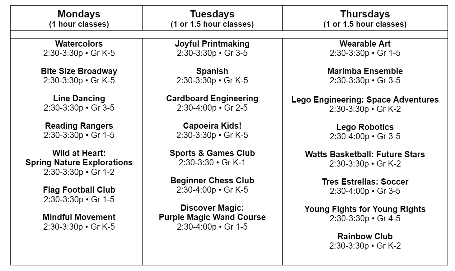 This Spring we’re offering 20+ classes ranging from Crafts & Performing Arts to STEM, Sports, Magic and more on Mondays, Tuesdays and Thursdays. See the full calendar below and learn more about these classes in the Spring catalog. For translation assistance, please call 206-252-7244.