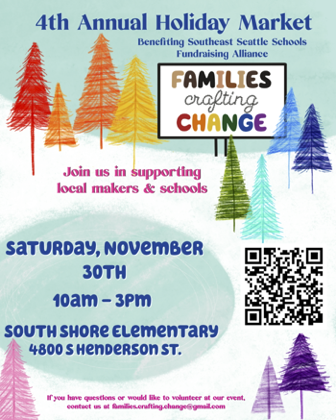 Level up your holiday shopping by supporting local makers and schools at the same time! Families Crafting Change Holiday Market is offered by parents/caregivers/students in South Seattle. Proceeds benefit our school through the SE Seattle Fundraising Alliance which equitably shares funds across schools in our community.