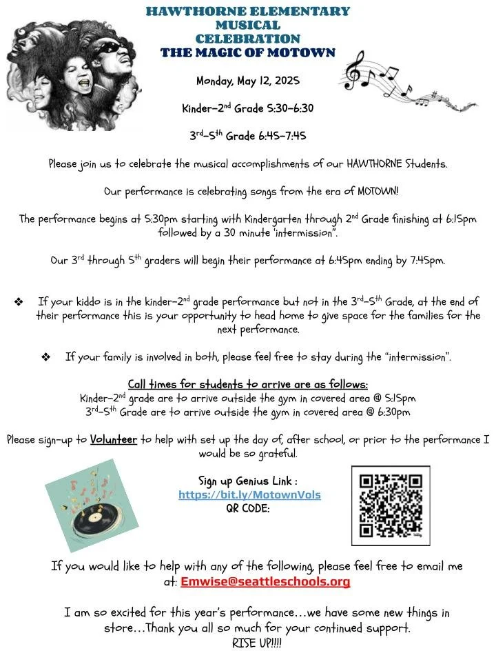 The all-school musical performance is Monday, May 12th featuring hits from Motown.