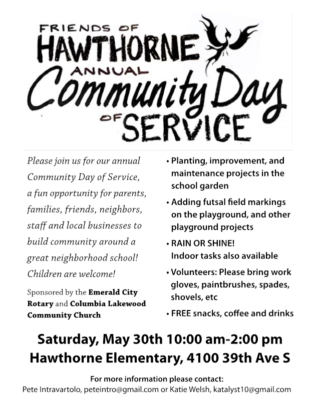 Special Thanks to the Students, Families, Staff and Community members of Hawthorne Elementary for inspiring each other to do Great works for our school. Our "Hawthorne Day of Service 2016" with the help of Emerald City Rotary was a Great Success this year!