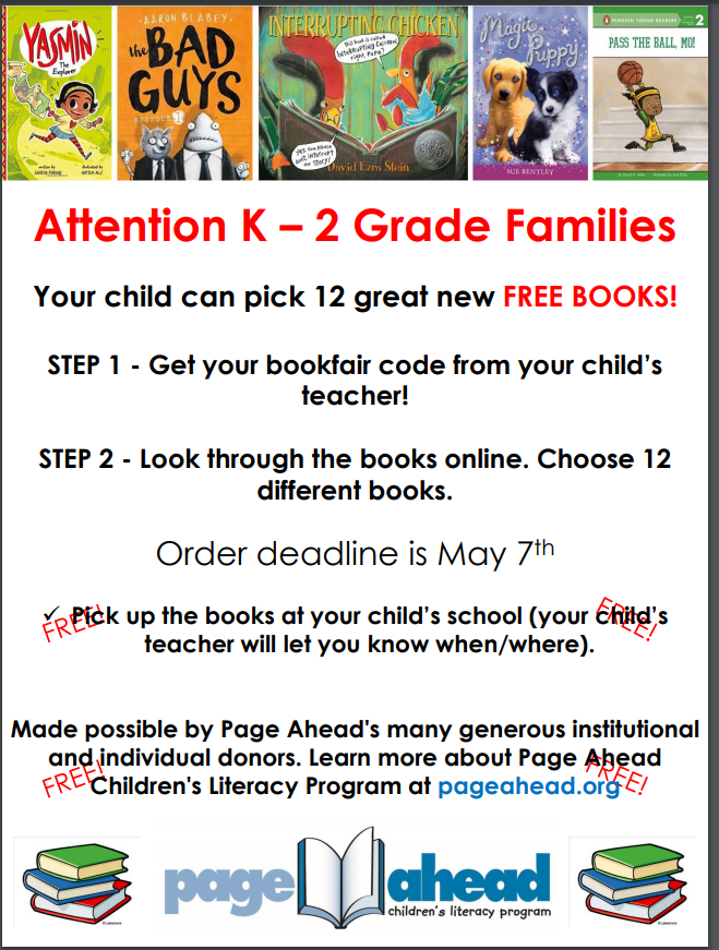 For K-2 families, our school is participating in Book Up Summer so each student in our class gets to choose 12 free books! The books will come to our school in June, and I will notify you when they have arrived to coordinate pick-up.